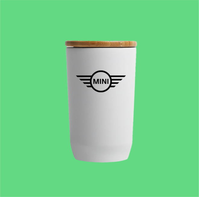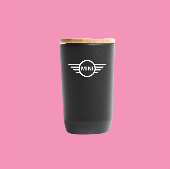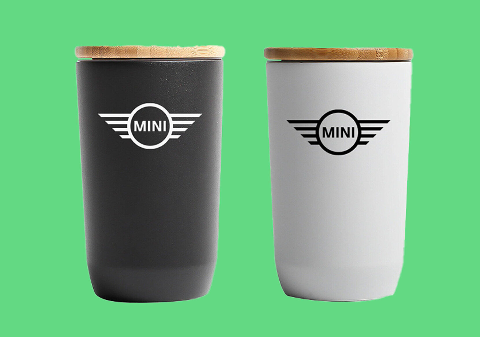 Double walled with an airtight lid, our Bam-boo Lid Mugs come with a surface primed and ready for our SKINZ for all your customisation needs. Customized with the iconic Mini Cooper logo specially for their event!