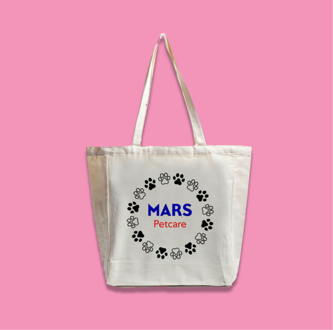 DTF Heat Transfer on our iconic A3 tote bags, done together in collaboration with Mars Petcare for pet enthusiasts! Displayed on our iconic A3 Canvas tote bag for carrying all your pets' needs.